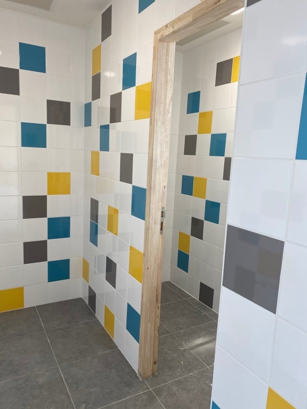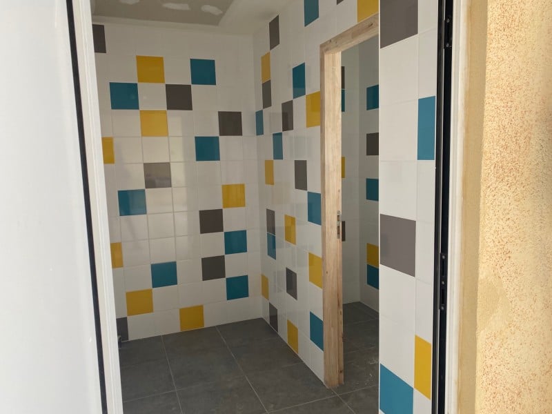 Toute l équipe a participer à la rénovation des divers sanitaires du bâtiment pour la partie sol en carrelages de sol 45×45 cm GRÈS CÉRAME et pour la partie faïence 20×20 aux coloris multiples avec un calpinage aléatoire